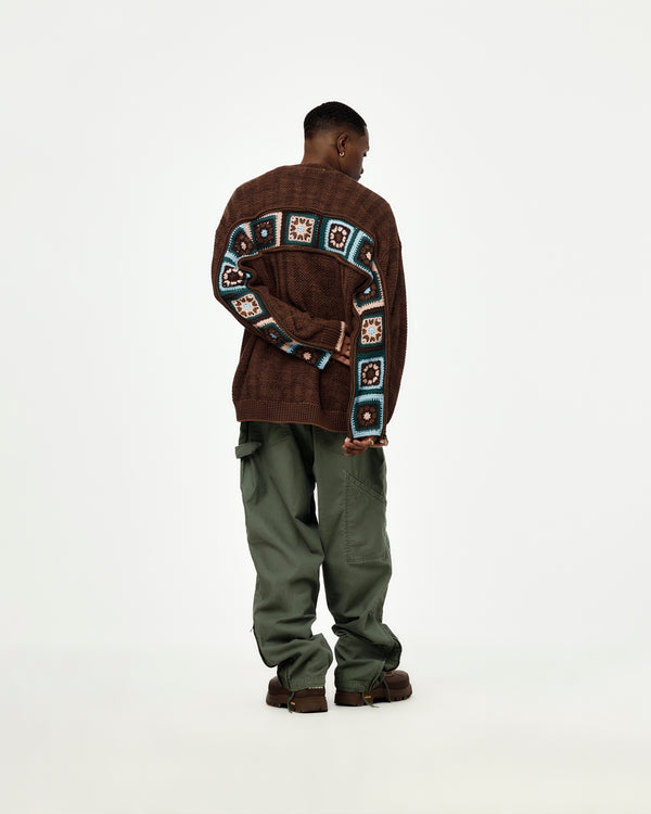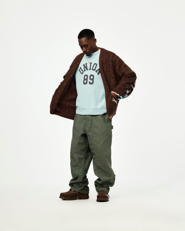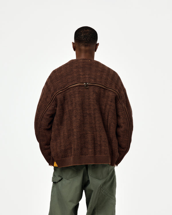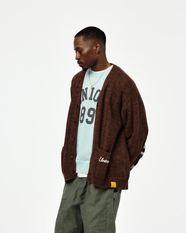 Part of the Union Los Angeles Spring 2026 collection, the Andrews Cardigan blends heritage knitwear with underground attitude. An oversized herringbone knit anchors the silhouette, while a concealed granny stripe detail—hidden behind a heavy double zip—adds depth. A layered piece inspired by early-90s LA creative communities.