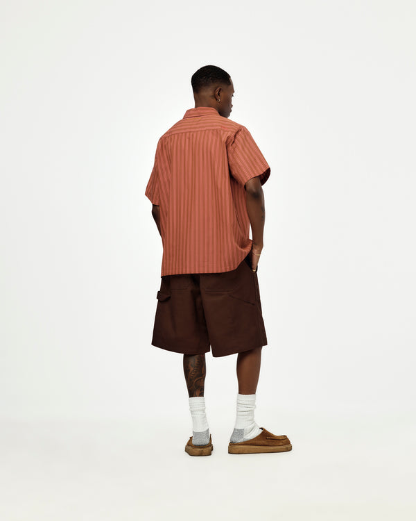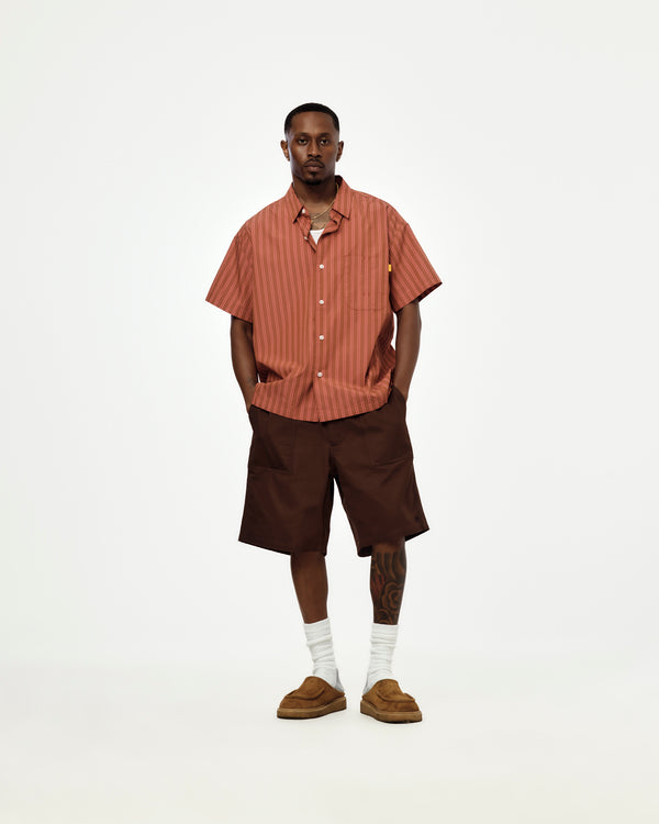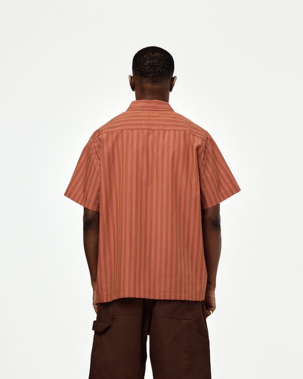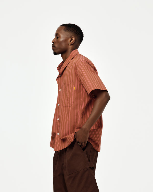 The Gramercy Shirt from Union Los Angeles Spring 2026 features pieced stripes, engineered seams, and inset shoulder panels. A boxy, slightly oversized fit captures the experimental styling seen across early-90s LA scenes.