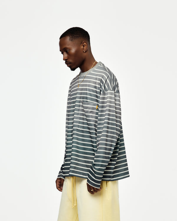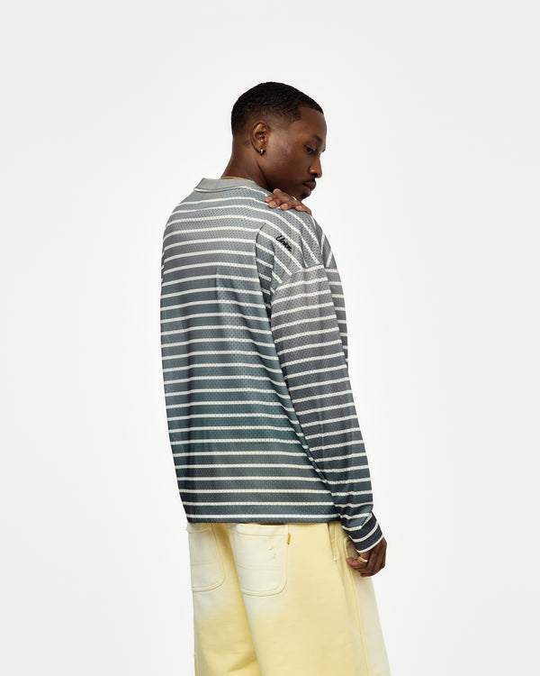 The Somerset LS Knit features striped mesh construction with sun-faded effect. Generous proportions and breathable texture reflect LA’s climate and analog-era styling.