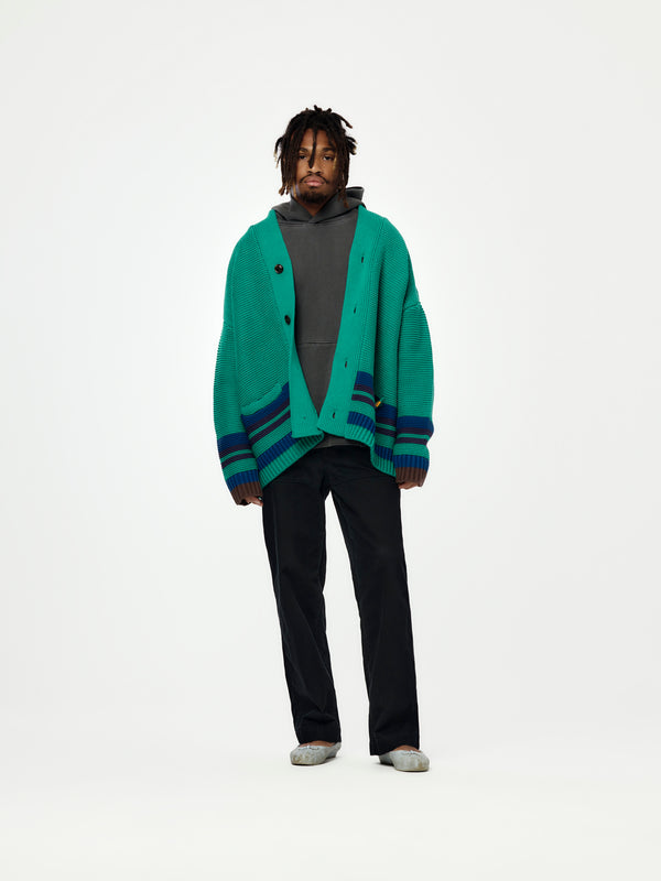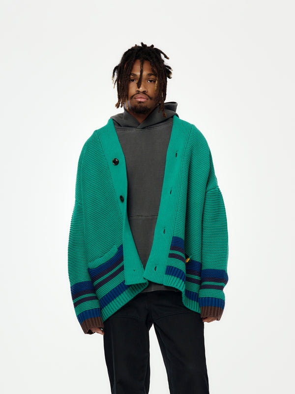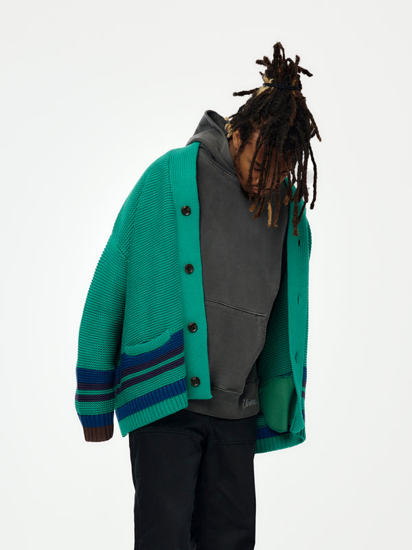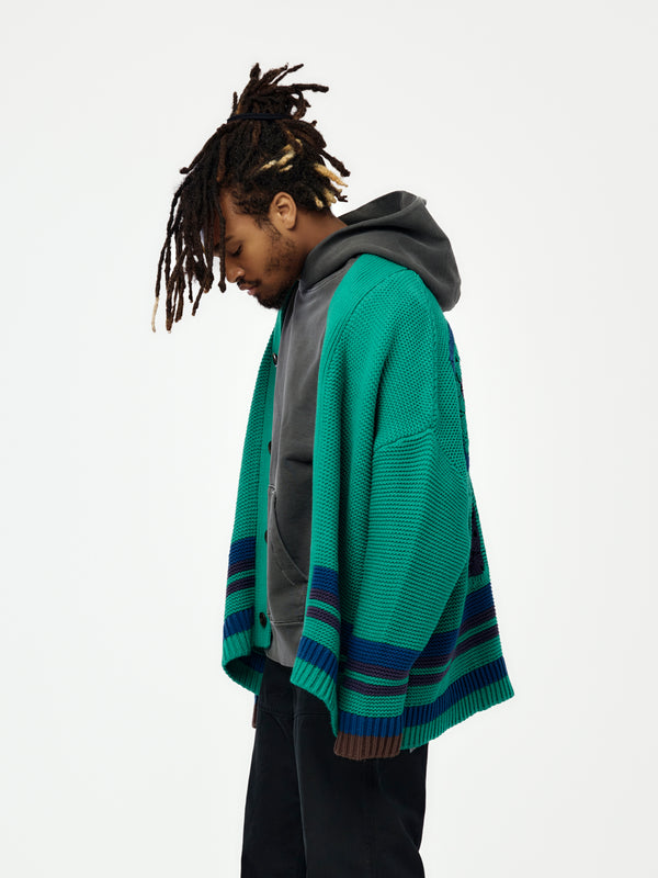 Expertly designed for warmth and style, our Wheatley Cardigan (Green) is the perfect addition to your winter wardrobe. Made from a heavy-knit material, it features a unique crochet patched design on the back, adding a touch of texture and uniqueness to your look.